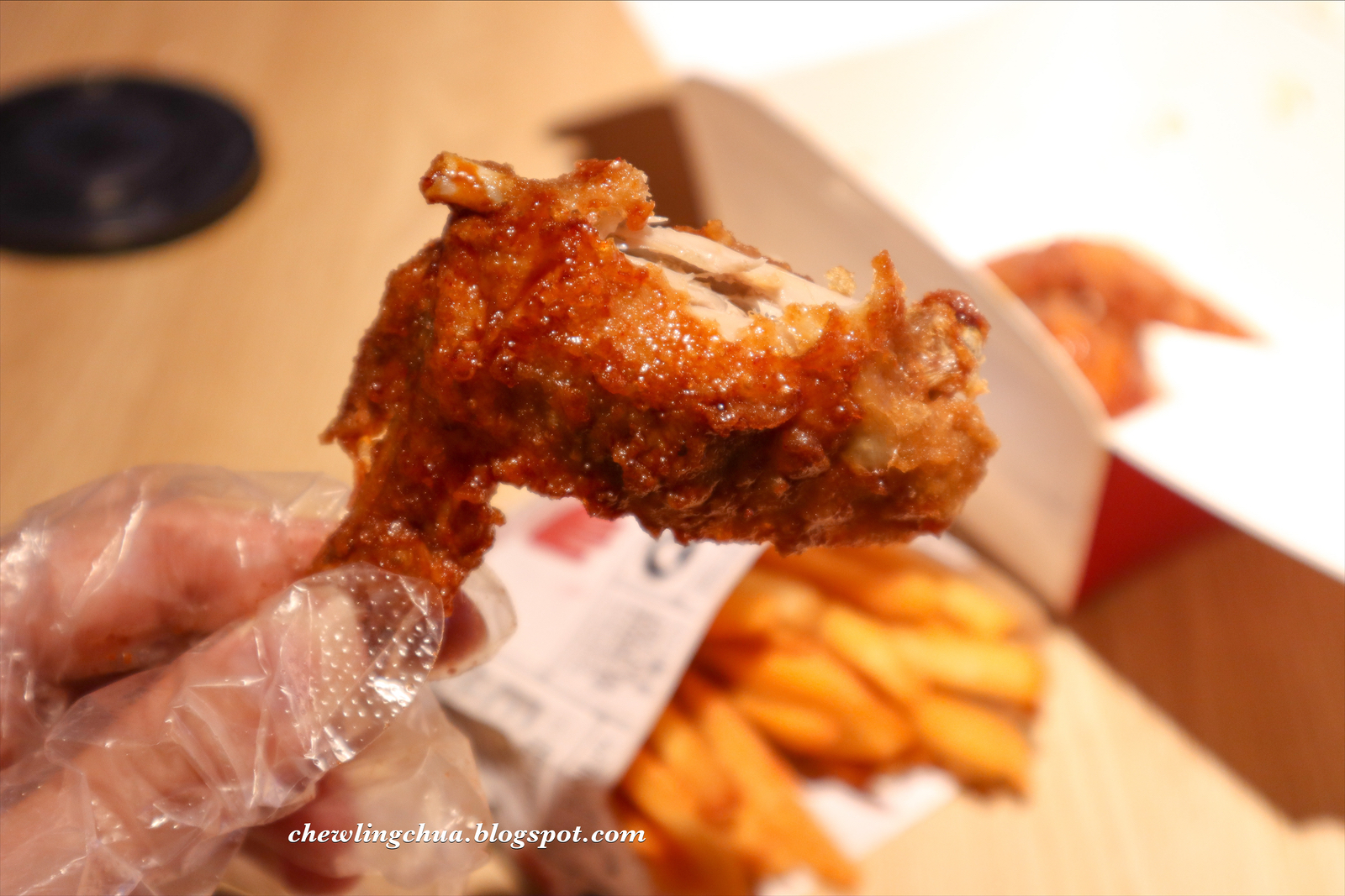 Their Korean Fried Chicken is the must-eat in the store. I'm totally falling in love with their Signature Fried Chicken since my first time tried it in Singapore a few years ago. Thus, I'm so excited and can't wait to visit it when I heard that the brand will start operating in my hometown soon. In the beginning, I would like to order Chicken Katsu Sandwich that I ate in Penang before, but so bad, it's not available. Hence, I ordered Signature Fried Chicken that comes with 1 Drumstick & 3 Wings (RM 15.90 for A La Carte | RM 20.90 Combo Set) at last. As usual, I picked the Mixed Sauces (Hot & Soy Garlic) flavour for my fried chicken.